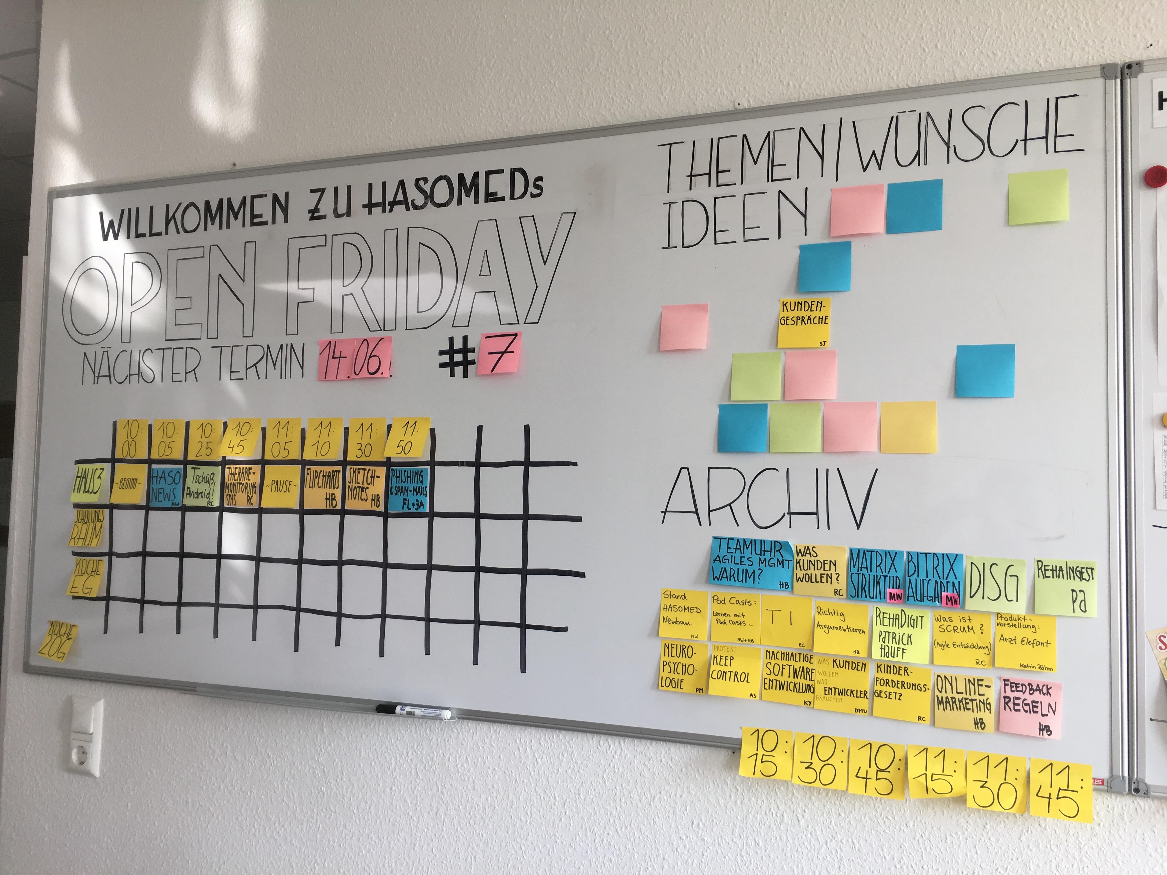 Der Open Friday wird veranstaltet, um sich auf dem aktuellen Entwicklungsstand zu halten. Im Viertelstunden Takt gibt es Vorträge von Mitarbeitern für Mitarbeiter. Wer arbeitet gerade Woran. Wir zeichnen den ‚Open Friday‘ auch auf, damit man sich die Vorträge hinterher noch einmal anschauen kann. Es hat sich jetzt eingebürgert, dass unser Geschäftsführer Matthias Weber beginnt und von Firmenneuigkeiten berichtet. Es werden ebenso neue Produkte oder Methoden vorgestellt.