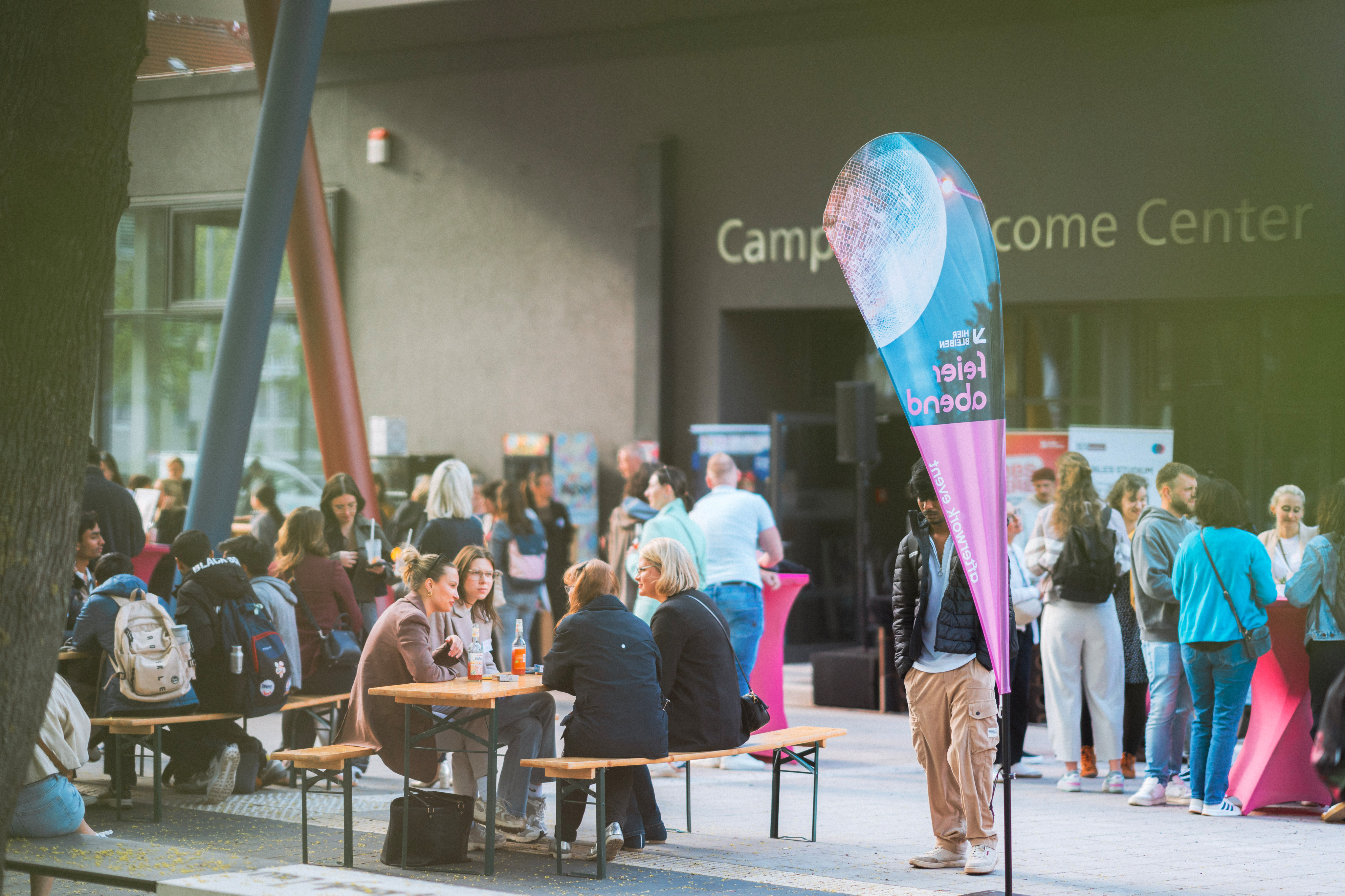 Über 100 Menschen – darunter kreative Köpfe, interessante Persönlichkeiten, Young Professionals und Netzwerker:innen aus ganz unterschiedlichen Bereichen – strömten zum Welcome Center auf dem Campus, um gemeinsam den FEIERABEND zu genießen. Was wir beobachten konnten: angeregte Gespräche, lächelnde Gesichter und eine rundum gelöste Stimmung. Ein schöner Beweis dafür, dass Magdeburg Afterwork einfach kann.