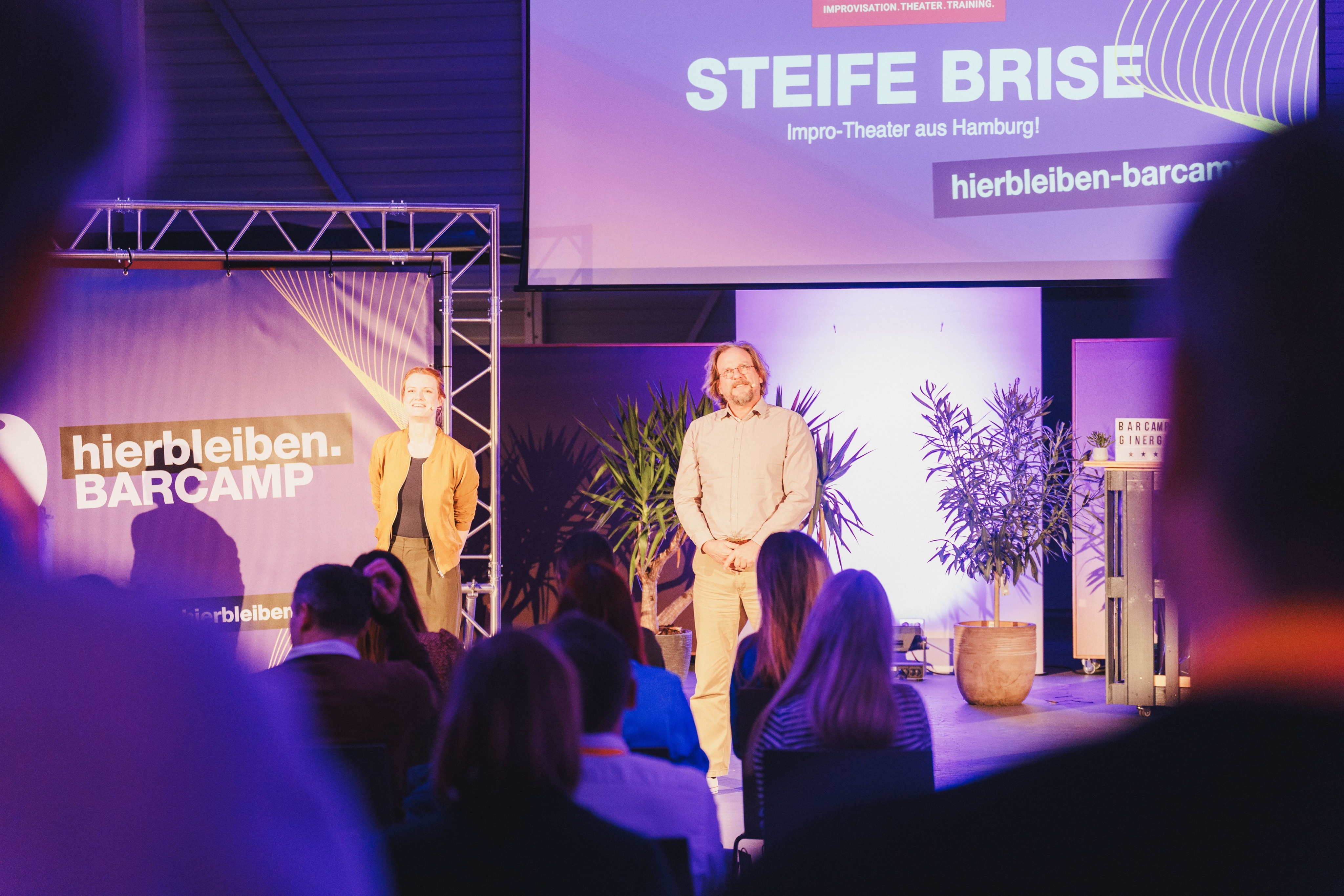 Am ersten Abend des hierbleiben. BARCAMPS war das Businesstheater Steife Brise extra aus Hamburg bei uns zu Gast. Als Icebreaker wurde mit Improtheater die Stimmung aufgelockert, Lachmuskeln wurden trainiert und die Bühne für die kommenden Pitches aufgewärmt.