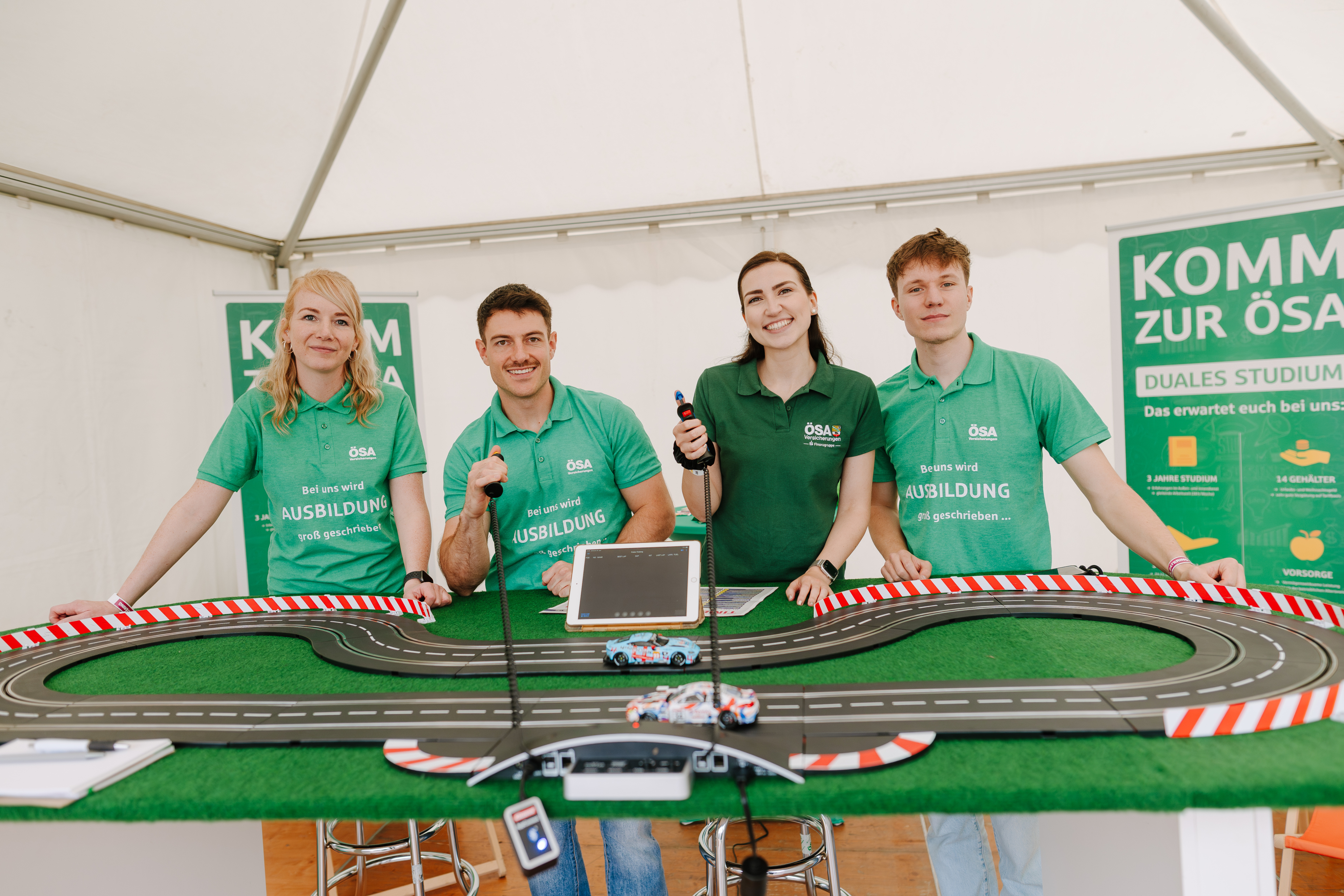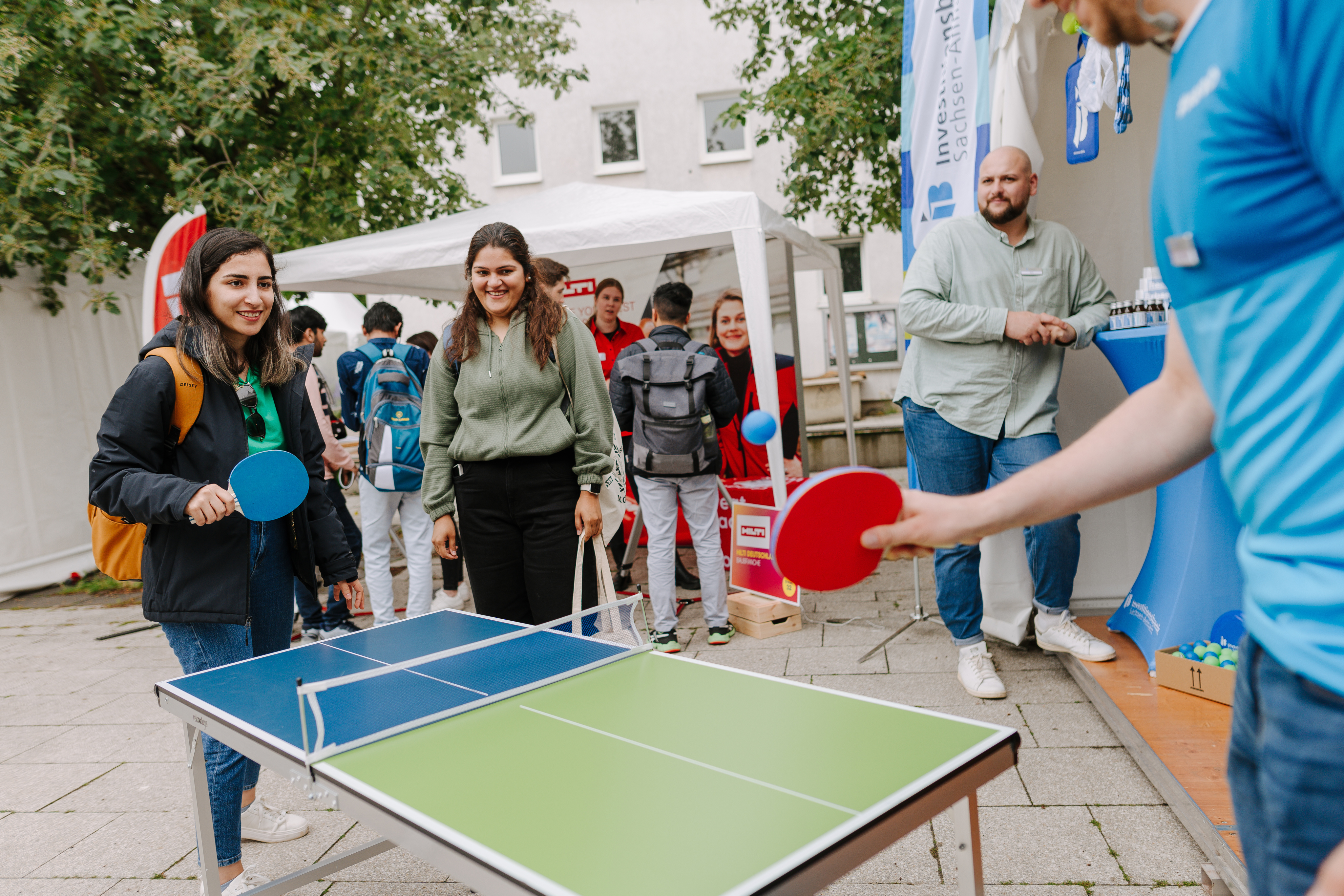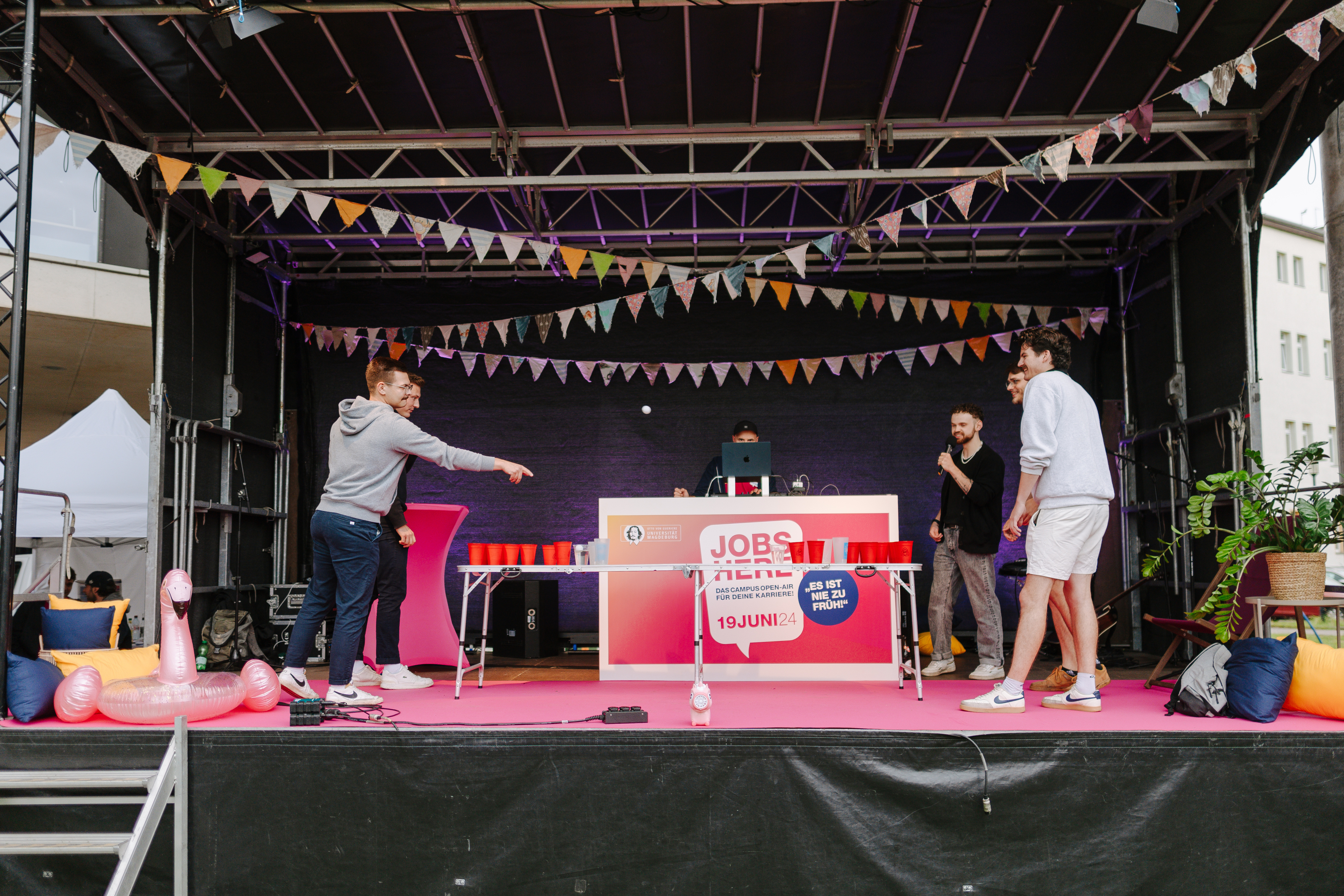 • Action und Spaß sind garantiert! Ob Beerpong mit deinem zukünftigen Arbeitgeber oder eine Runde Tischkicker mit deiner neuen Lieblingskollegin – hier kannst du dich in lockerer Atmosphäre connecten. Probiere dich bei den All Day Longs der Unternehmen aus oder lausche inspirierenden Talks. Du entscheidest, was dein Highlight wird!