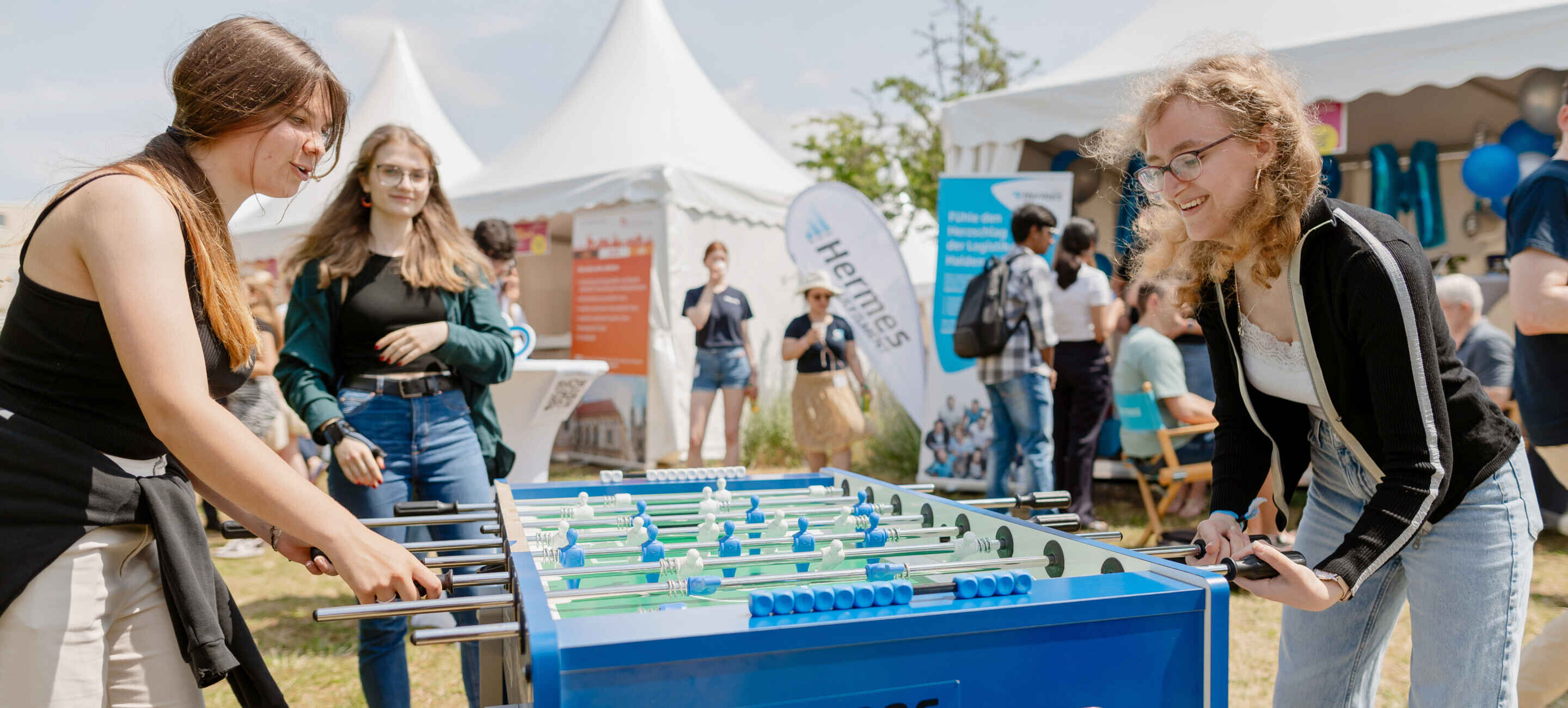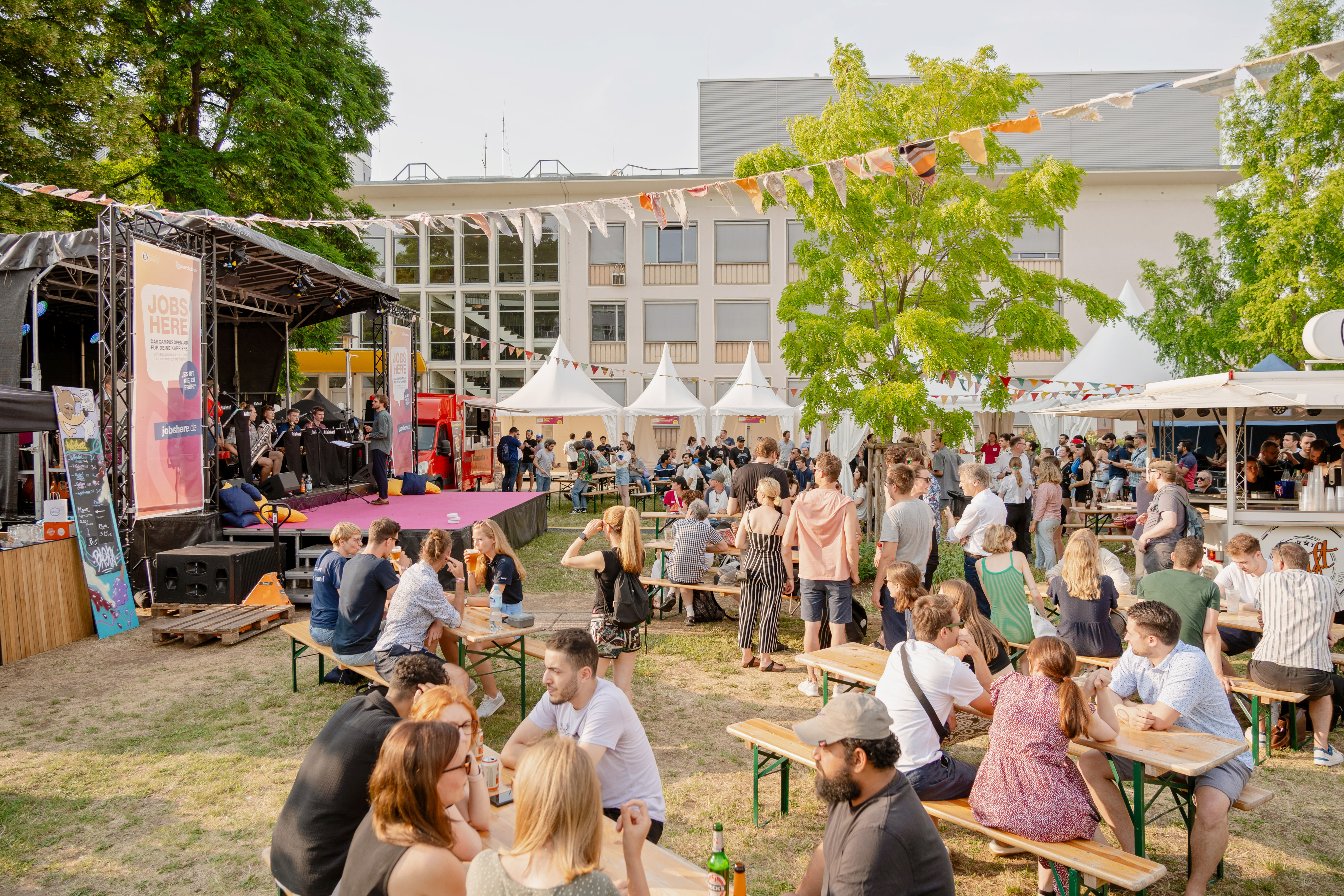 Beim JOBS HERE trefft ihr eure Zielgruppe in einer ganz besonderen Festival-Atmosphäre. Mit Wimpelketten, Live-Musik und Street-Food sorgen wir für den besonderen Vibe. Ihr seid aber die Main-Acts des Festivals und das Line-Up. Mit eigenen Aktionen und Überraschungen am Stand sorgt ihr für das Kennenlernen auf Augenhöhe: Den nächsten Lieblingskollegen im Flunky-Ball besiegen? Riesenjenga mit dem HR-Team? Beim JOBS HERE ist alles möglich. So entstehen Verbindungen, die weit über einen klassischen Messekontakt hinausgehen.
